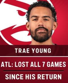 根據(jù)統(tǒng)計(jì),自特雷-楊12月19日傷愈復(fù)出以來(lái),這位4屆全明星后衛(wèi)代表老鷹出戰(zhàn)了5場(chǎng)比賽,場(chǎng)均砍下20.8分10助攻,但在此期間老鷹遭遇了7連敗。