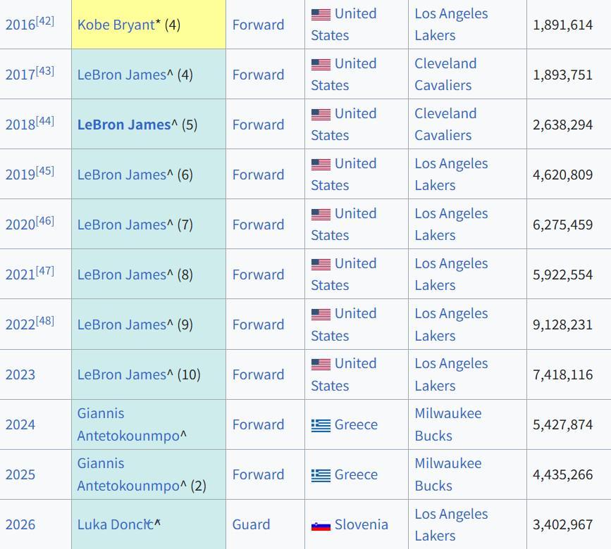 值得一提的是,在此前10年的全明星票選中,東契奇的隊(duì)友詹姆斯7次奪得票王,此外字母哥2次奪魁,科比則在退役賽季奪得票王。