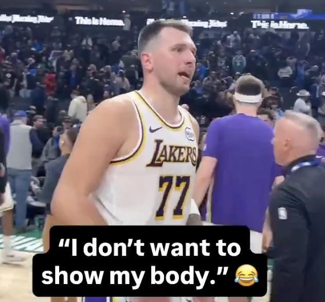 比賽結(jié)束后,獨(dú)行俠球員納吉-馬紹爾找到湖人隊(duì)球員東契奇,希望能與他交換球衣,而東契奇表示:“嘿,納吉,一會(huì)兒回去我再給你球衣,因?yàn)槲也幌朐谶@露出我的身體。”