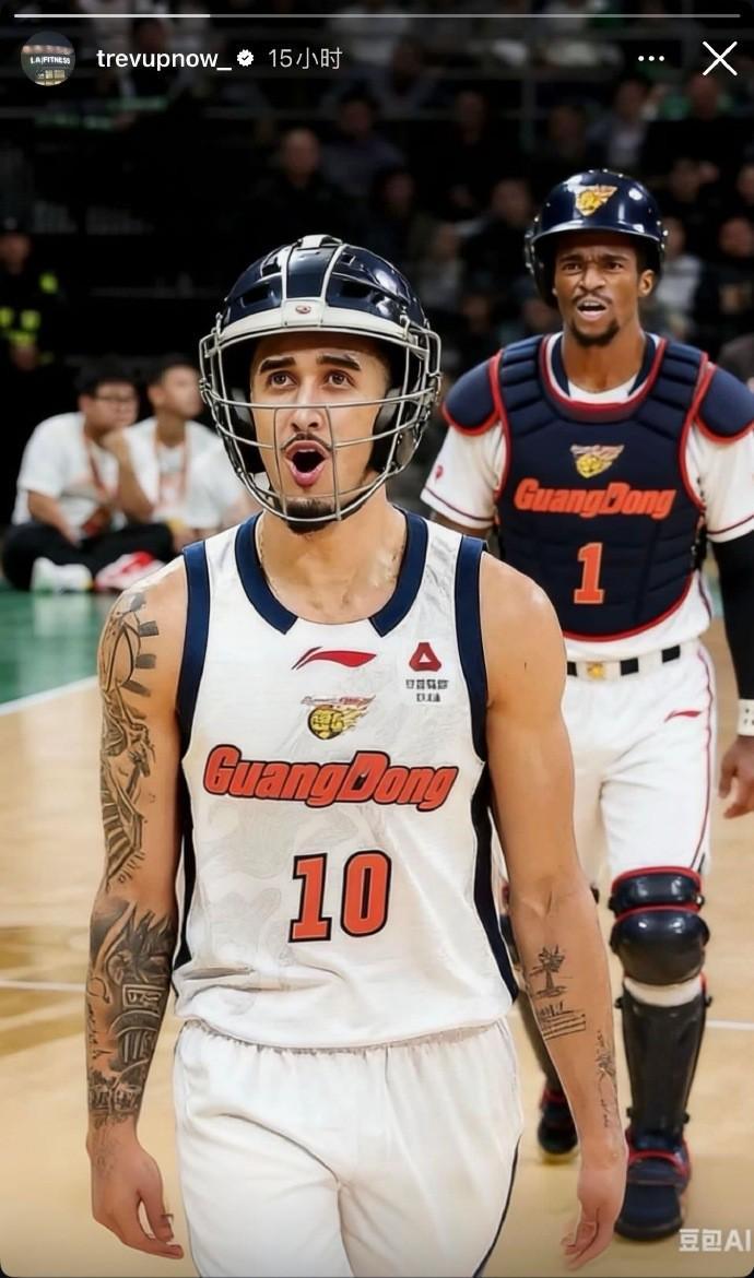 賽后,廣東外援薩姆納和奎因都在社媒發(fā)了一張自己帶護(hù)具上場的AI圖片。