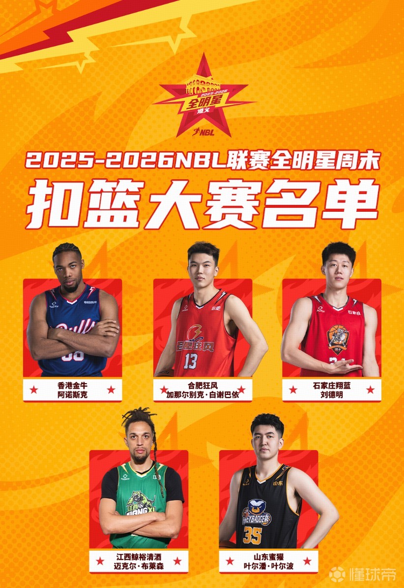 扣籃大賽名單:阿諾斯克(香港金牛)、加那爾別克-白謝巴依(合肥狂風(fēng))、劉德明(石家莊翔藍(lán))、邁克爾-布萊森(江西鯨裕清酒)、葉爾潘-葉爾波(山東蜜獾)。
