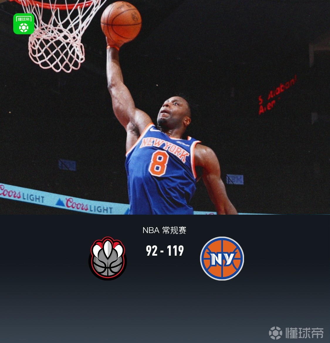第四節(jié)猛龍馬穆凱拉什維利拿下7分,尼克斯約什-哈特拿下11分,最終猛龍92-119不敵尼克斯