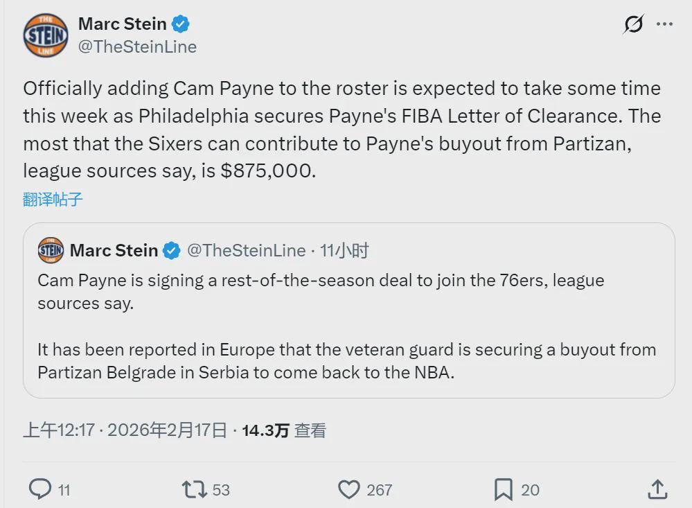 也就是說,剩余的87.5萬買斷費需要佩恩自掏腰包。2024年夏天,亞布塞萊為了重返NBA,自己支付了165萬美元的買斷費、加盟76人!2025年10月份,步行者曾經(jīng)給了佩恩一份訓練營合同,佩恩被裁之后離開NBA、前往歐洲打球。