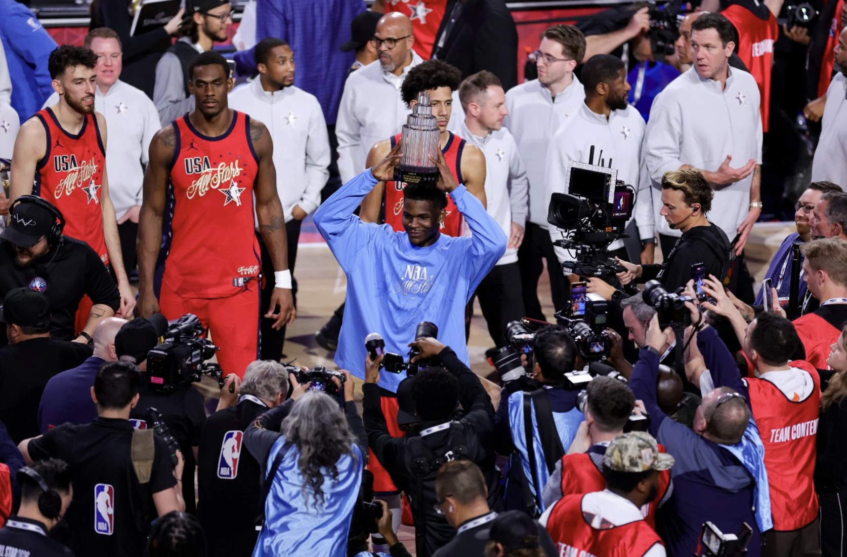 初步統(tǒng)計(jì)結(jié)果顯示,2026年全明星賽的收視率比2025年全明星賽高出87%。收視高峰出現(xiàn)在美國東部時間晚上7點(diǎn)至7點(diǎn)15分,當(dāng)時美國隊(duì)以48比45戰(zhàn)勝世界隊(duì)。