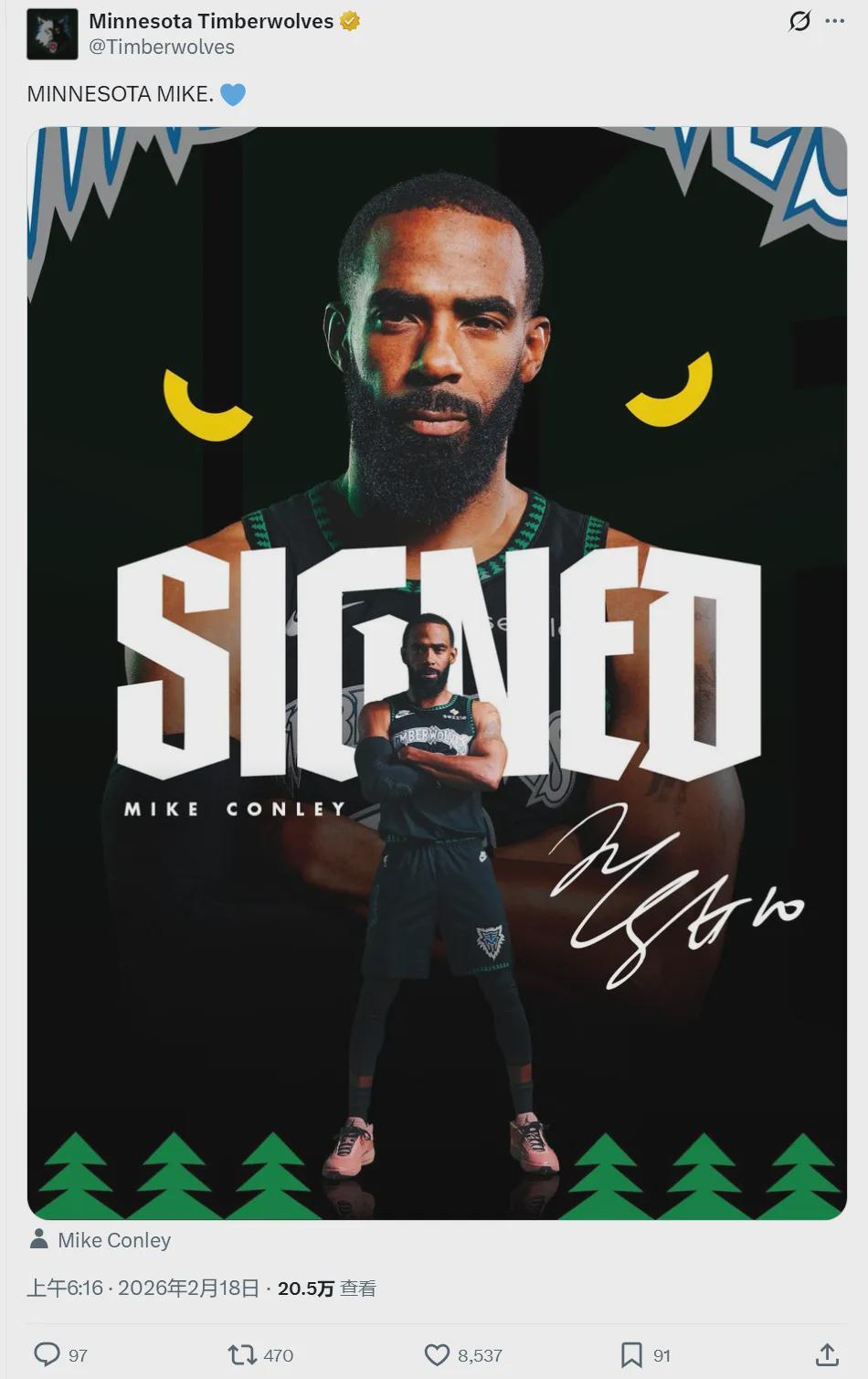 北京時間2月18日上午6點,明尼蘇達森林狼隊官方宣布:球隊正式簽回38歲老將邁克-康利。這是一份老將底薪合同,雙方簽約至本賽季結束。康利原有合同2年2100萬美元,今年夏天到期。此前他被黃蜂裁掉,恢復了自由身。