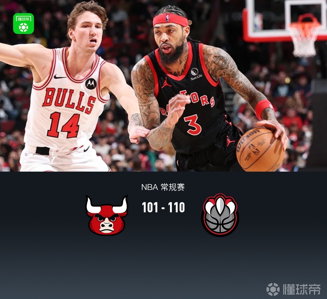 第四節(jié)公牛亞布塞萊拿下6分,猛龍默里-博伊爾斯拿下5分,最終公牛101-110不敵猛龍