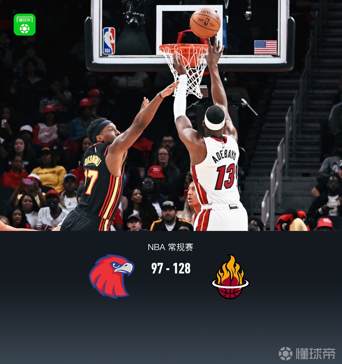 北京時間2月21日NBA 常規(guī)賽,亞特蘭大老鷹對陣邁阿密熱火。半場老鷹51-57熱火,最終老鷹97-128熱火。
