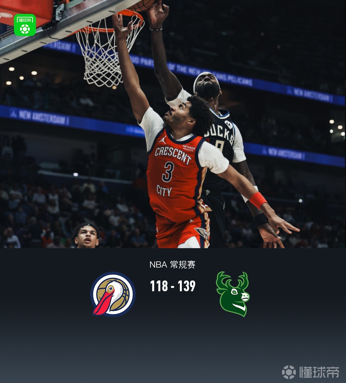 北京時間2月21日NBA 常規(guī)賽,新奧爾良鵜鶘對陣密爾沃基雄鹿。半場鵜鶘65-71雄鹿,最終鵜鶘118-139雄鹿。