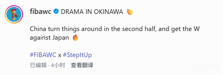 該內(nèi)容被FIBA官方發(fā)布在Instagram和X雙平臺(tái)上,截至目前,F(xiàn)IBA官方中Instagram上修改了文案,修改后的文案為:沖繩上演精彩好戲,中國(guó)隊(duì)下半場(chǎng)完成逆轉(zhuǎn),擊敗日本隊(duì)拿下勝利。而X平臺(tái)仍未修改文案。