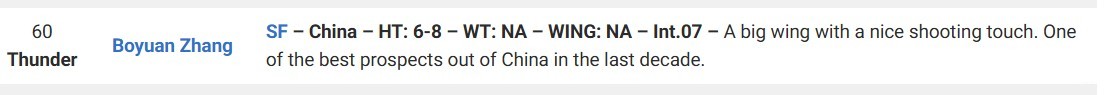 該選秀網(wǎng)站表示:“張博源是一名擁有出色投射手感的大個子球員,過去十年中來自中國的最優(yōu)秀新星之一。”