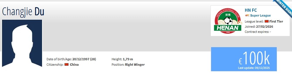 德轉(zhuǎn)更新,杜長杰自由身回歸河南隊(duì),球員上賽季效力于上海嘉定匯龍(寧波)。