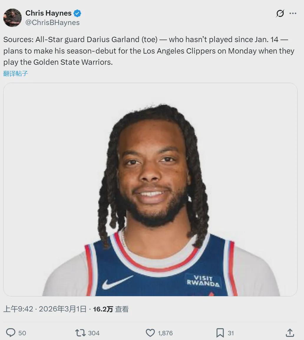 北京時(shí)間3月1日,據(jù)NBA名記Chris Haynes報(bào)道,快船全明星后衛(wèi)達(dá)里厄斯-加蘭,將在3月3日對陣勇士的比賽中迎來快船生涯首秀。過去一個(gè)半月,加蘭一直在處理他的腳趾傷勢。今年交易截止日被送到快船,但加蘭還沒出戰(zhàn)過。