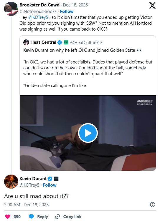 另一位球迷提到了杜蘭特2016年離開俄克拉荷馬城雷霆隊(duì)加盟金州勇士隊(duì)的事件,他表示難道奧拉迪波和霍福德的加盟還不能讓他留在雷霆而不去勇士嗎,杜蘭特再次以嘲諷的方式回復(fù):“你還耿耿于懷嗎?”