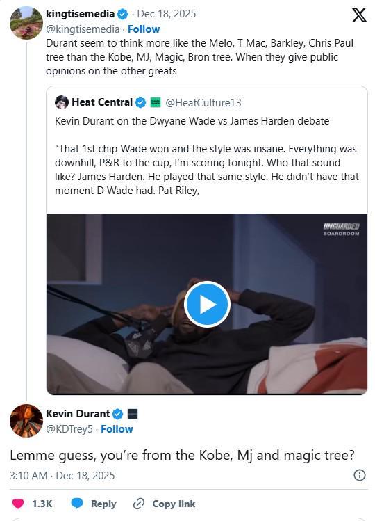 一位網(wǎng)友轉(zhuǎn)發(fā)了杜蘭特點(diǎn)評(píng)哈登和韋德的訪談片段,并聲稱杜蘭特與喬丹、科比、魔術(shù)師約翰遜和詹姆斯等傳奇球星沒有相同的思維方式,杜蘭特對(duì)此進(jìn)行了嘲諷式的回應(yīng):“讓我猜猜,你是來自科比、邁克爾-喬丹和魔術(shù)師約翰遜那個(gè)時(shí)代的人吧?”