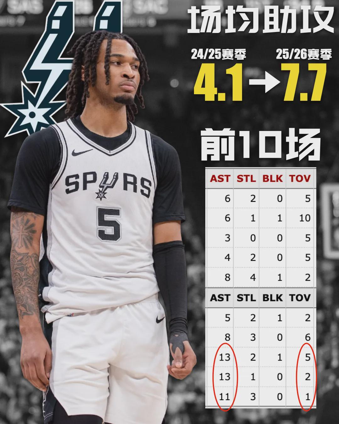 隨著賽季深入以及卡斯?fàn)枲顟B(tài)漸入佳境,他的助攻失誤比只會(huì)越來越好看。這是卡斯?fàn)杻?yōu)秀的比賽內(nèi)容支撐的事實(shí),如果你有關(guān)注馬刺隊(duì)的比賽,你會(huì)發(fā)現(xiàn)卡斯?fàn)栐趫?chǎng)上處理球的成熟度,遠(yuǎn)不像失誤次數(shù)那樣離譜。相反,你會(huì)覺得這個(gè)21歲的年輕人舉重若輕。雖然馬刺有文班這個(gè)怪物,但在文班身邊打控衛(wèi),可不只是把球丟掉天上等他扣進(jìn)去那么簡(jiǎn)單......因此,馬刺新任主帥米奇-約翰遜才愿意把球權(quán)都交到他手上支配,讓他去發(fā)號(hào)施令。