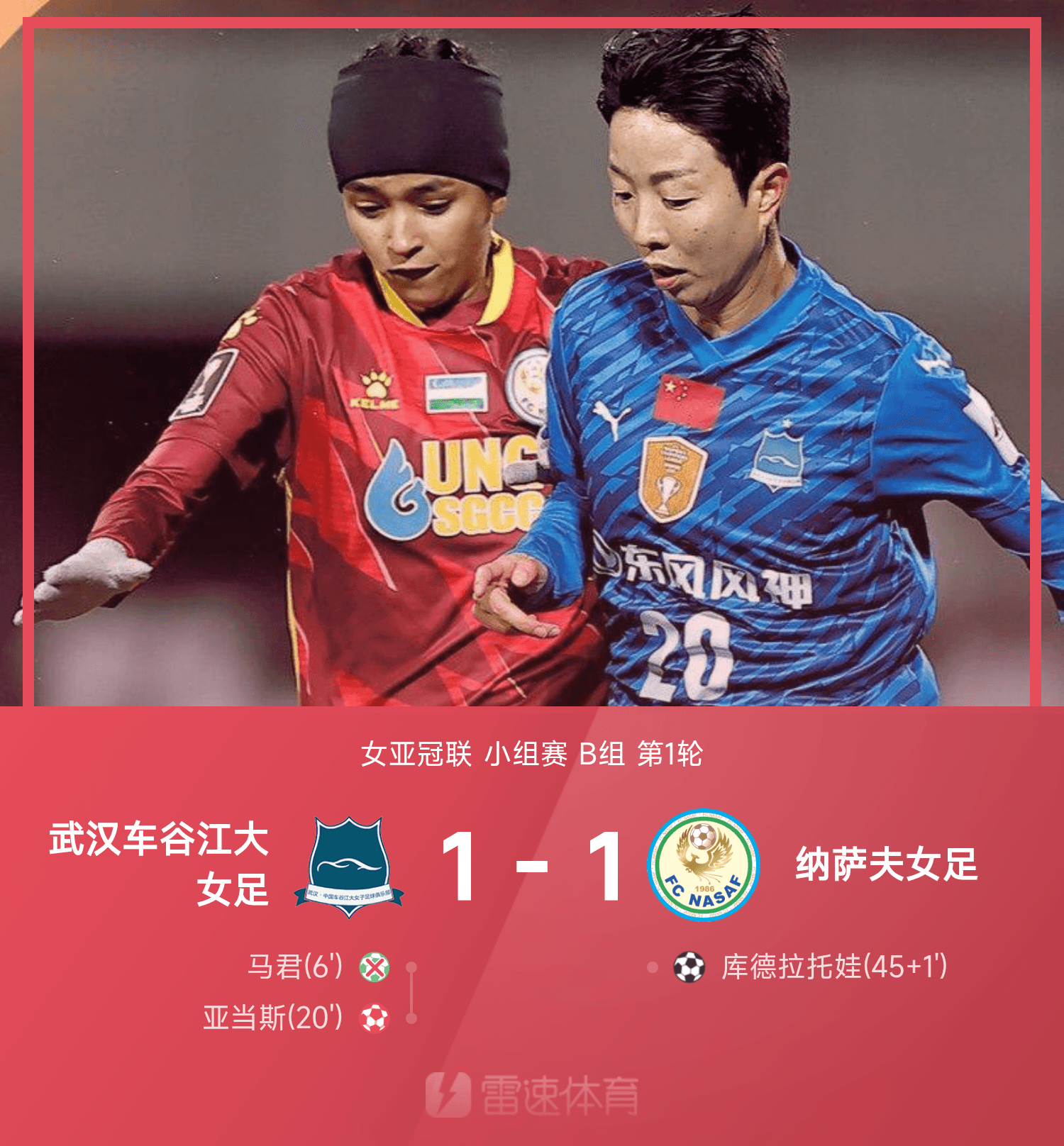 雷速體育11月17日訊 25/26賽季女亞冠聯(lián)小組賽B組第1輪,武漢車谷江大女足1-1戰(zhàn)平納薩夫女足。