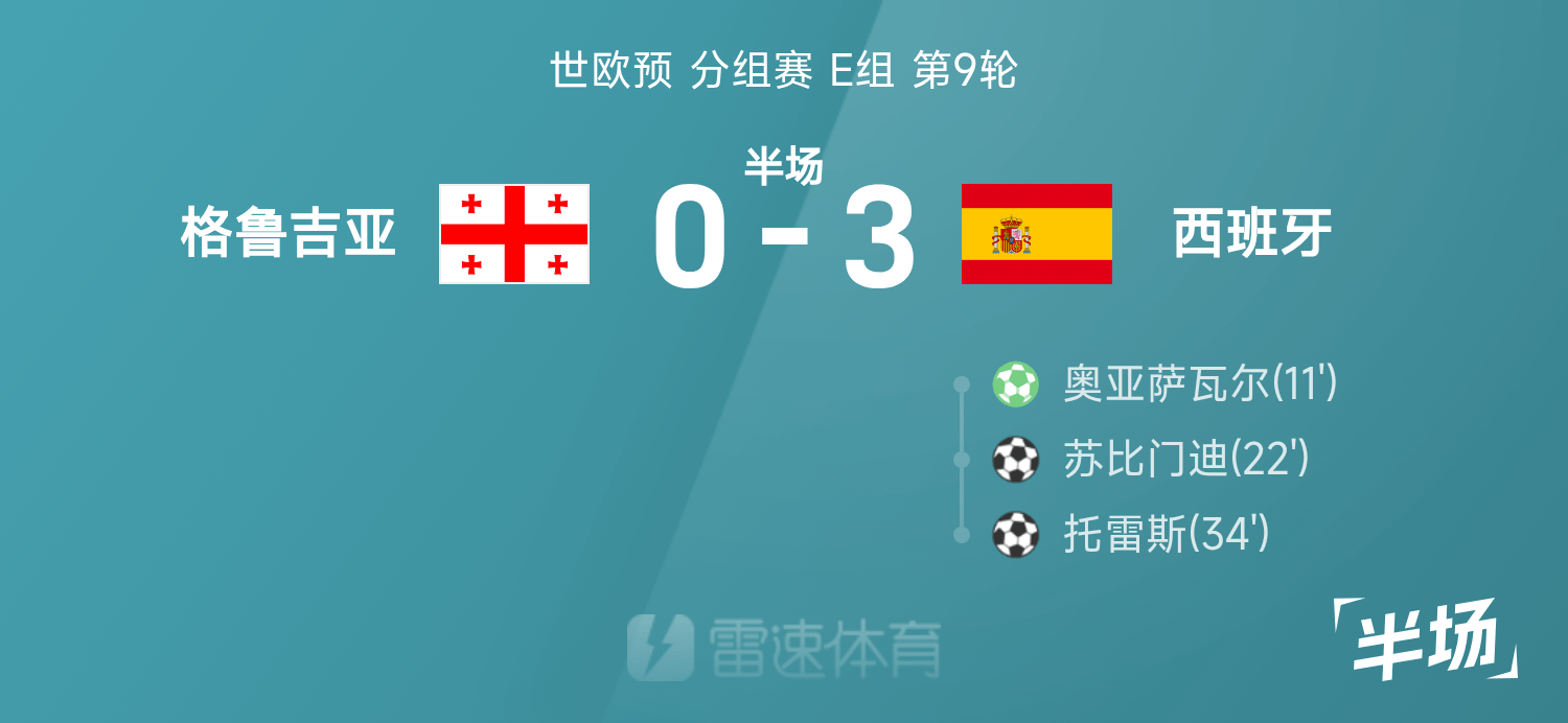 世歐預(yù)半場:奧亞薩瓦爾傳射,西班牙3-0格魯吉亞