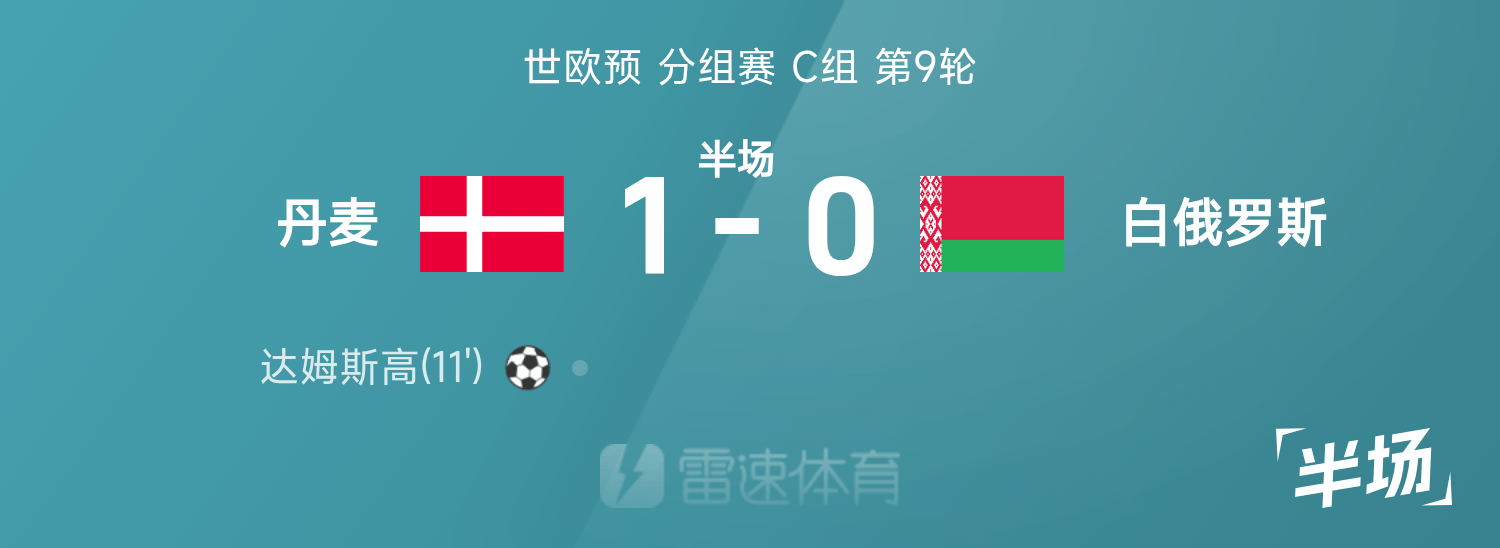 世歐預(yù)半場:達姆斯高世界波破僵,丹麥暫1-0白俄羅斯