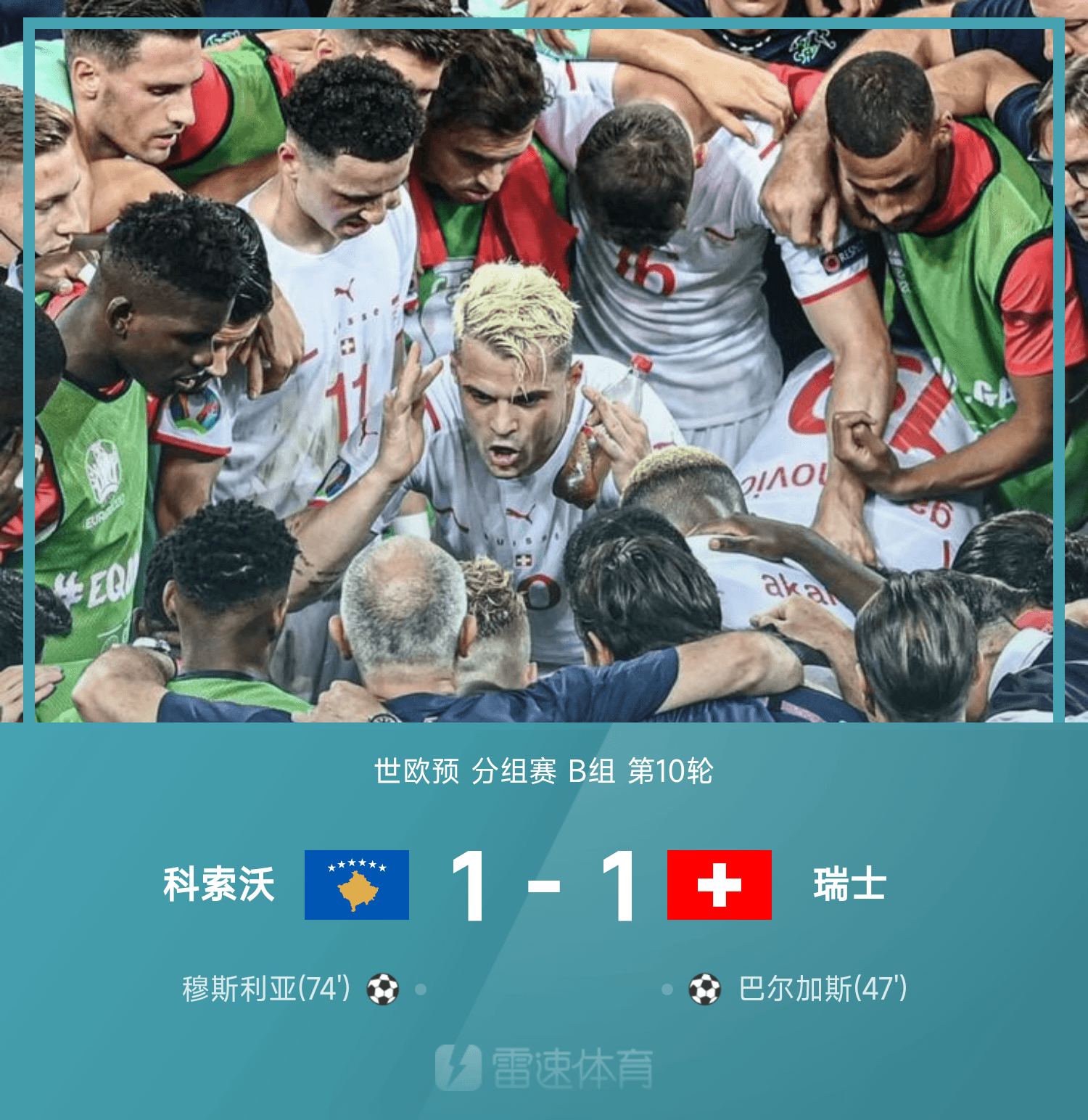 雷速體育11月19日訊 26賽季世歐預(yù)分組賽B組第10輪,科索沃主場以1-1戰(zhàn)平瑞士。
