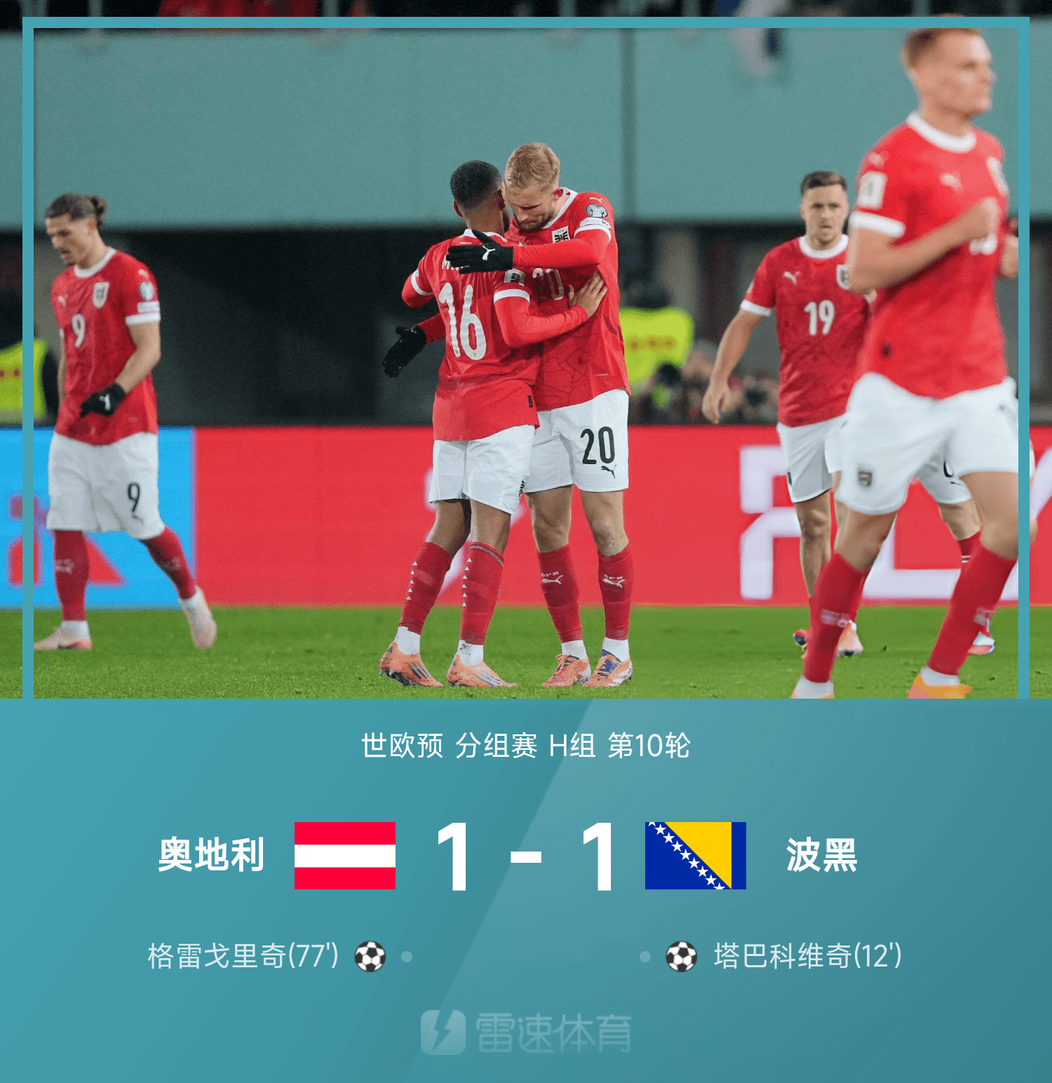 雷速體育11月19日訊 26賽季世歐預(yù)分組賽H組第10輪,奧地利1-1戰(zhàn)平波黑。