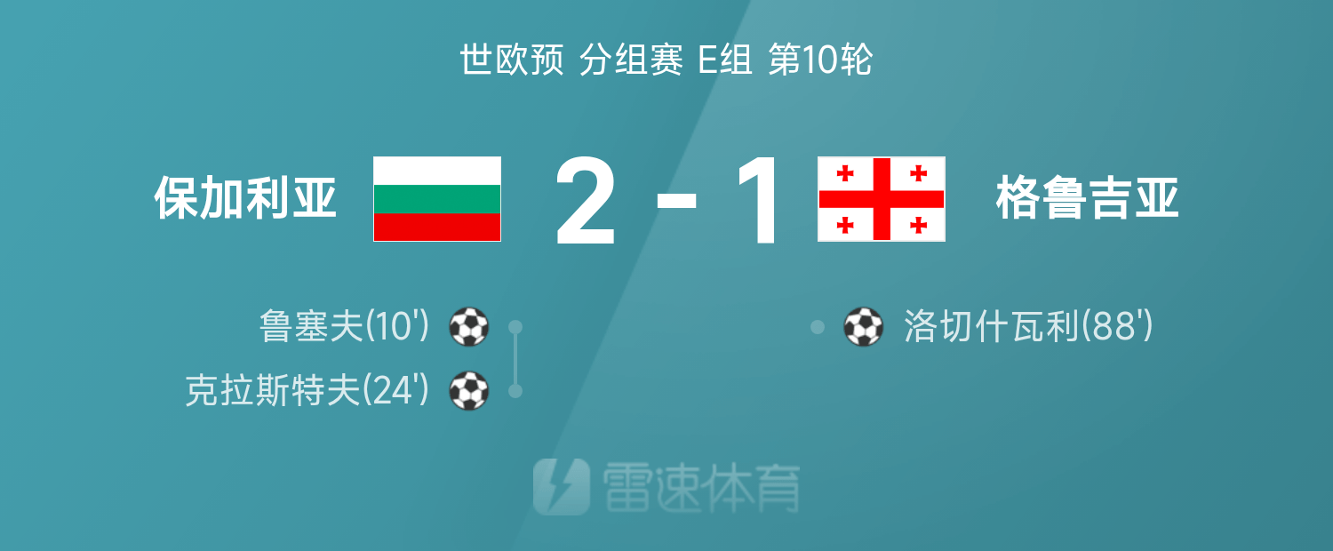 雷速體育11月19日訊 26賽季世歐預(yù)分組賽E組第10輪,保加利亞2-1戰(zhàn)勝格魯吉亞。
