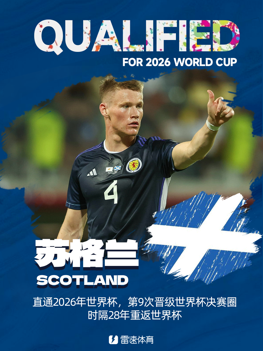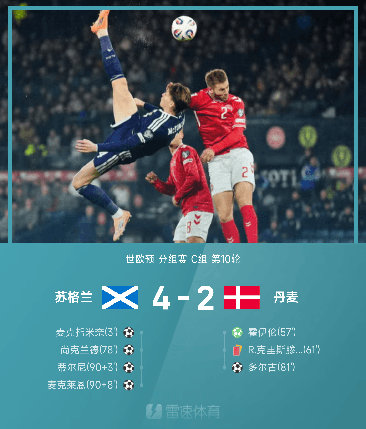 雷速體育11月19日訊 世預(yù)賽歐洲區(qū)小組賽C組第6輪,蘇格蘭4-2絕殺丹麥,自1998年后首次重返世界杯舞臺。