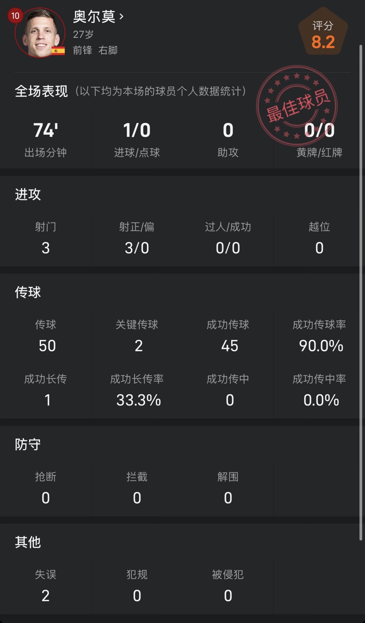 奧爾莫vs土耳其數(shù)據(jù):為球隊先拔頭籌,傳球成功率90%