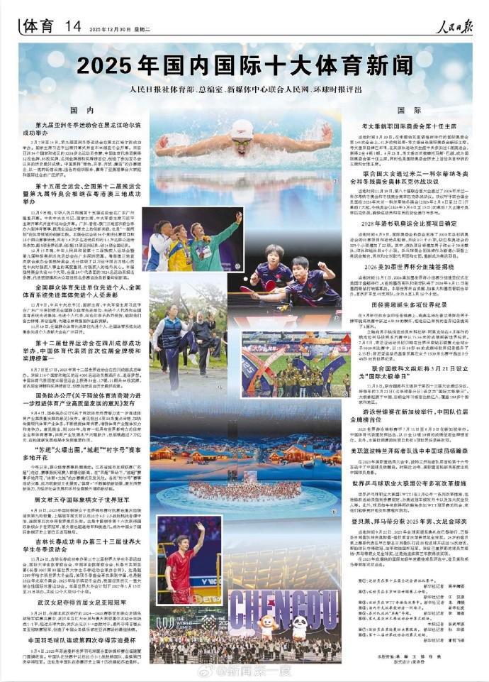 人民日?qǐng)?bào)國際十大體育新聞:登貝萊、邦馬蒂分獲2025年男、女足金球獎(jiǎng)上榜