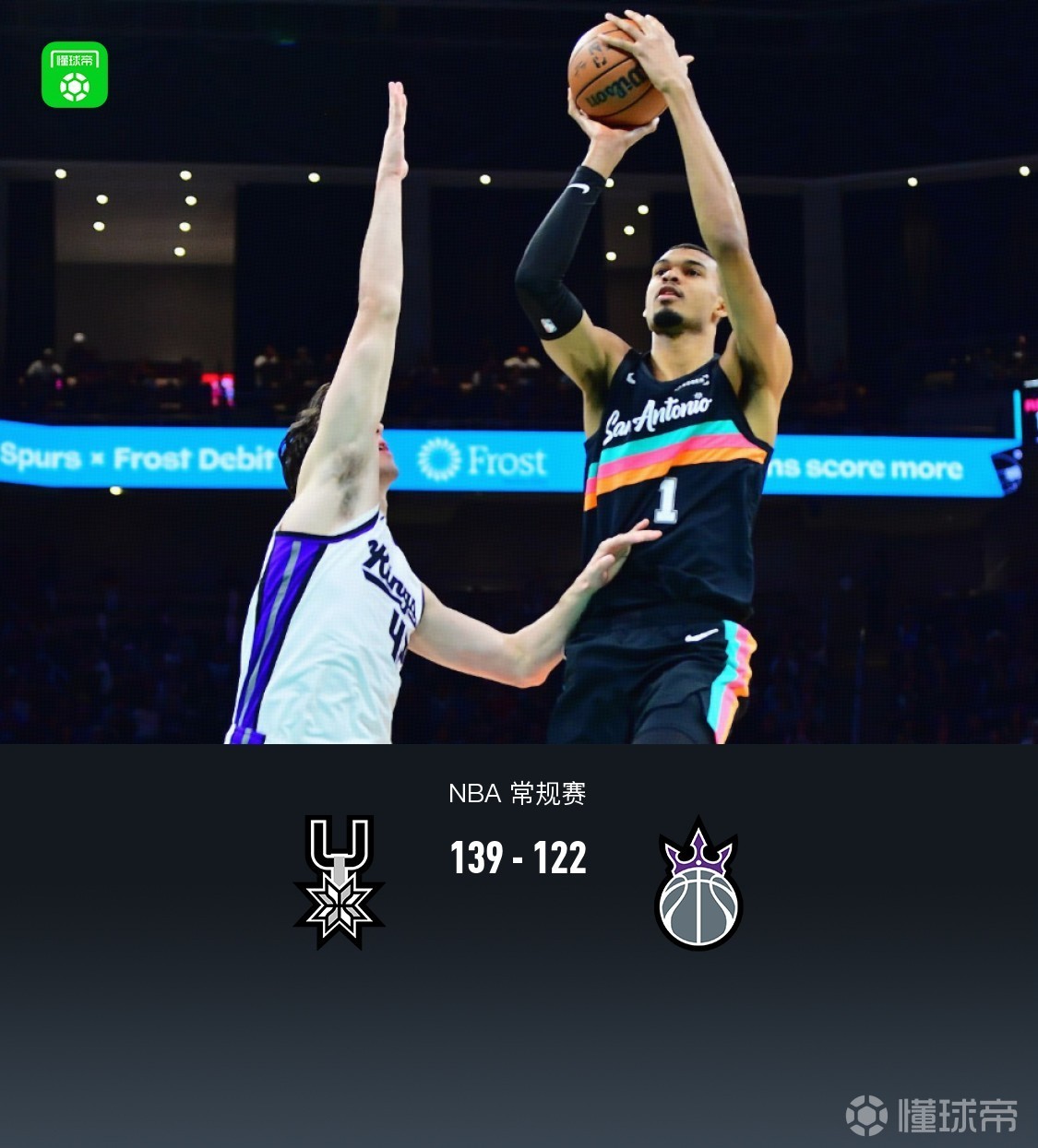 馬刺139-122送國(guó)王16連敗,文班亞馬28+15+6+4帽,德羅贊20分