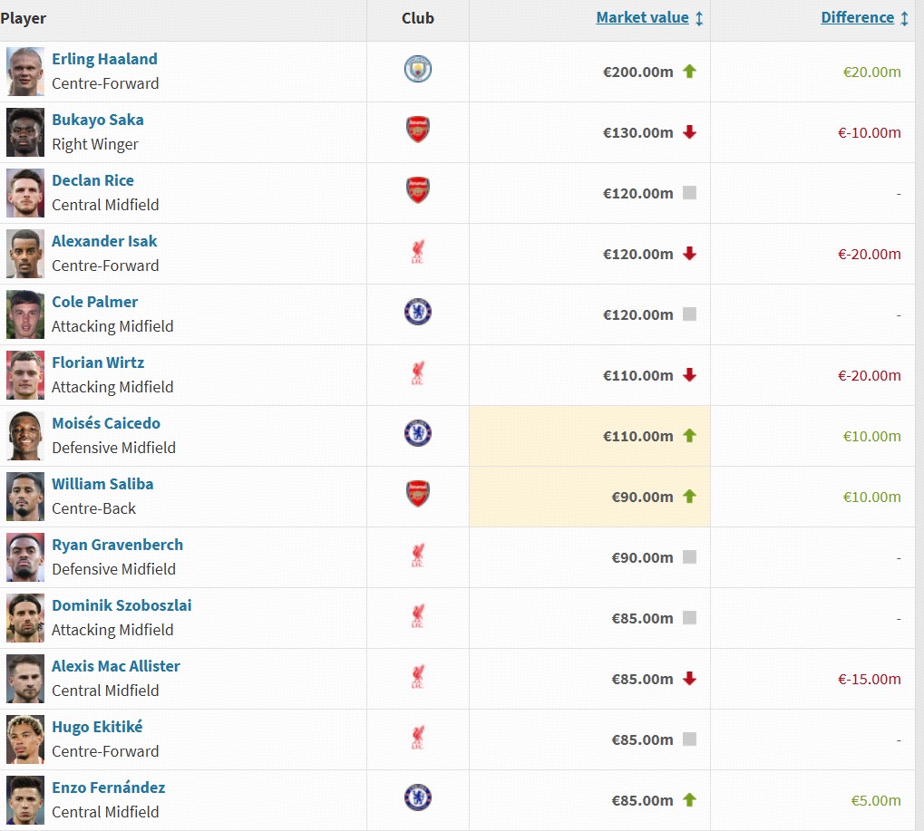 英超球員身價更新:哈蘭德漲至2億歐,薩卡降至1.3億歐