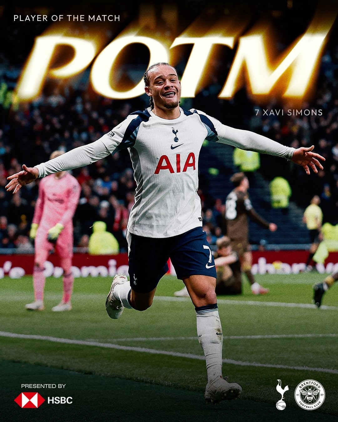 1射1傳,哈維-西蒙斯當(dāng)選熱刺2-0布倫特福德一役隊(duì)內(nèi)最佳球員