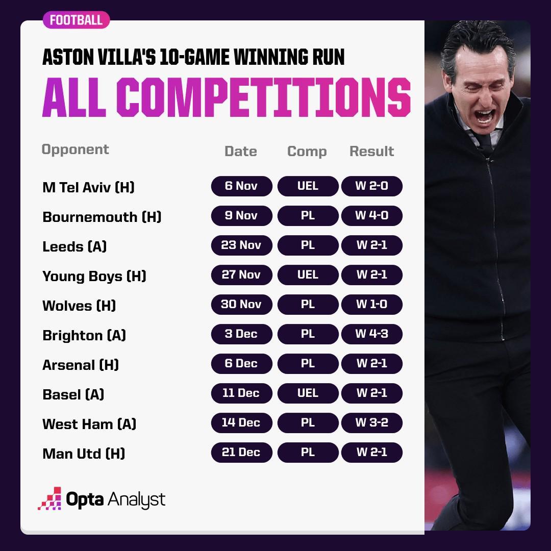如果客勝切爾西,維拉將追平隊(duì)史最長(zhǎng)11連勝
