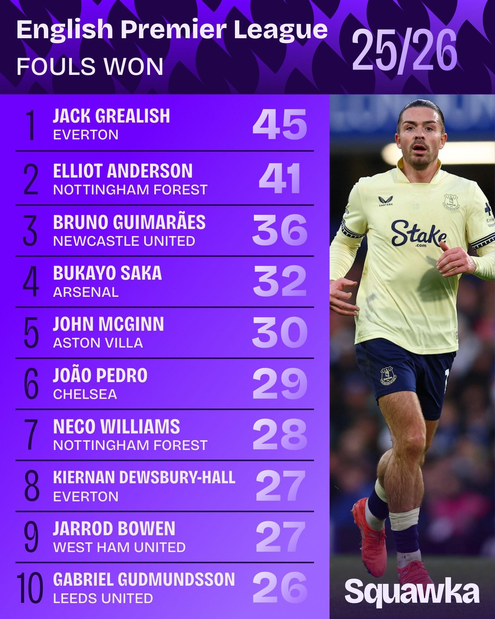 本賽季英超被犯規(guī)榜:格拉利什45次第一、薩卡32次第四