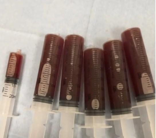 記者:蔣圣龍接受微創(chuàng)穿刺手術(shù),從腎臟部位抽出了6管積液