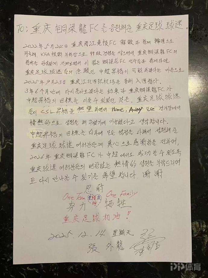 張外龍手寫信致球迷: 懇請大家繼續(xù)支持重慶銅梁龍