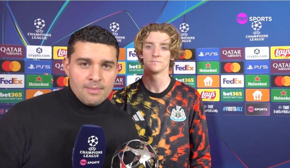 歐冠聯(lián)賽階段第6輪,紐卡斯?fàn)柨蛨?chǎng)2-2戰(zhàn)平勒沃庫(kù)森。紐卡前鋒安東尼-戈登在賽后接受了TNT體育墨西哥