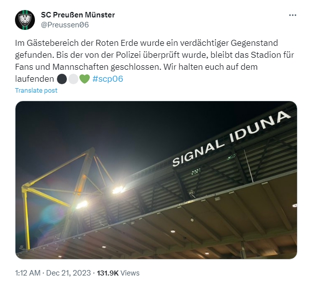官方消息傳來,原定于北京時(shí)間12月21日凌晨2點(diǎn)進(jìn)行的普魯士明斯特與多特蒙德2隊(duì)之間的德丙比賽被迫推遲。原因在于警方在羅特艾德球場(chǎng)附近發(fā)現(xiàn)了一物疑似雷管的物體。明斯特官方社媒發(fā)布聲明稱:“