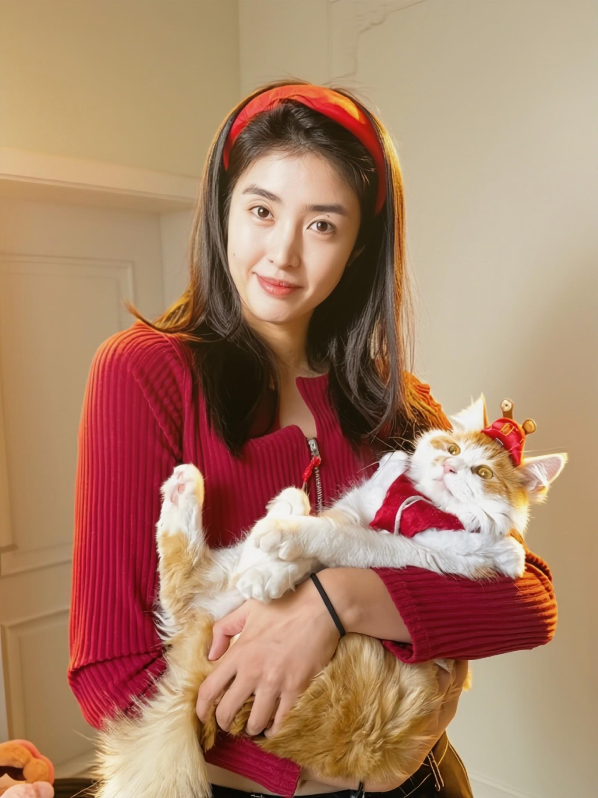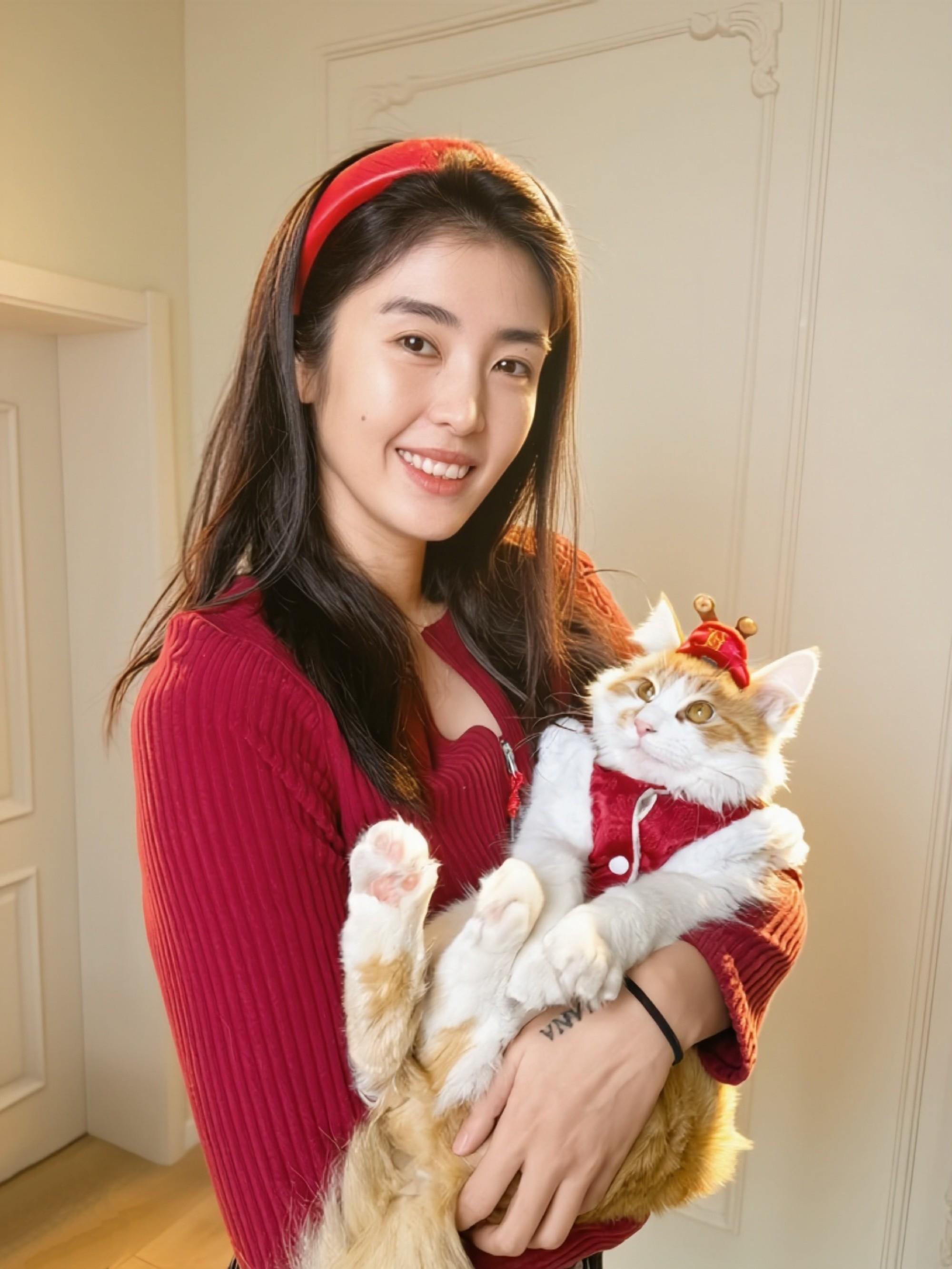 在照片中,趙麗娜穿著圣誕紅的毛衣,戴著紅色的發(fā)箍,懷里抱著小貓,也穿著紅色喜慶的衣服和帽子。