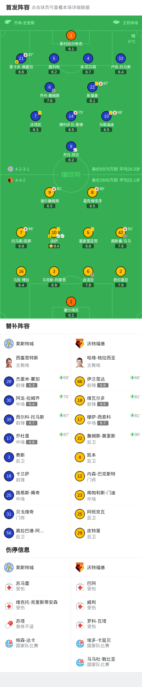 北京時(shí)間12月26日,英格蘭足球冠軍聯(lián)賽第23輪展開較量,萊斯特城坐鎮(zhèn)主場(chǎng)迎戰(zhàn)沃特福德。比賽中,萊斯特城球員喬丹-詹姆斯接隊(duì)友助攻率先破門,為主隊(duì)取得領(lǐng)先。隨后,沃特福德由奧斯曼-馬馬接洛薩傳球扳平比分。易邊再戰(zhàn),沃特福德繼續(xù)發(fā)力,波洛克在進(jìn)攻中再度接到洛薩助攻完成進(jìn)球,幫助球隊(duì)實(shí)現(xiàn)反超。最終全場(chǎng)比賽結(jié)束,萊斯特城以1-2不敵沃特福德。