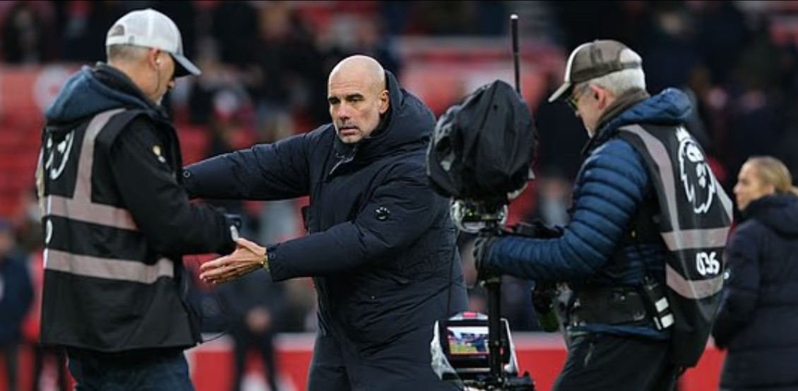 隨后可以看到瓜迪奧拉顯然十分沮喪地舉起手臂,并憤怒地盯著攝像機。這位西班牙主帥隨后做出了夸張的手勢,要求攝像師讓到一邊,對方照做了。