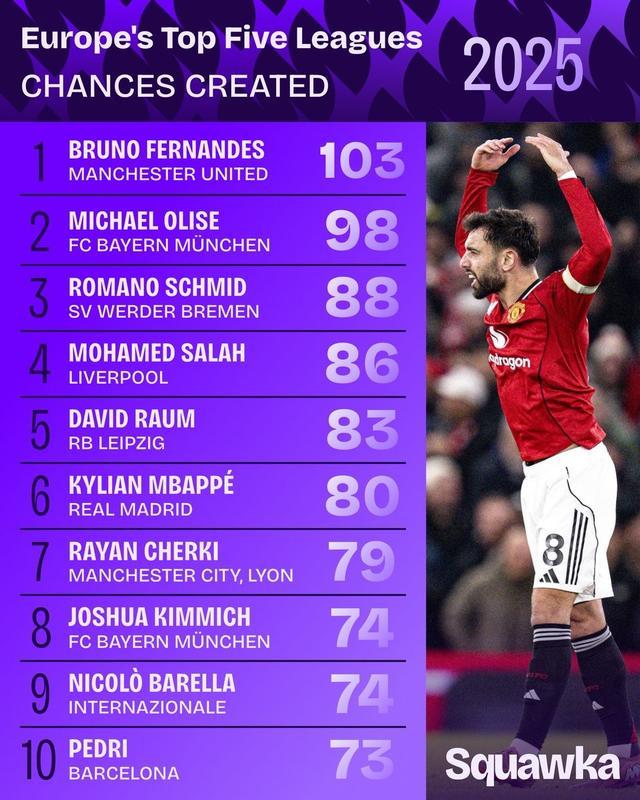 據(jù)統(tǒng)計(jì),2025年歐洲五大聯(lián)賽“創(chuàng)造機(jī)會(huì)次數(shù)”排行榜出爐。曼聯(lián)中場(chǎng)布魯諾-費(fèi)爾南德斯以103次強(qiáng)勢(shì)領(lǐng)跑,拜仁邊鋒奧利塞以98次位列第二。