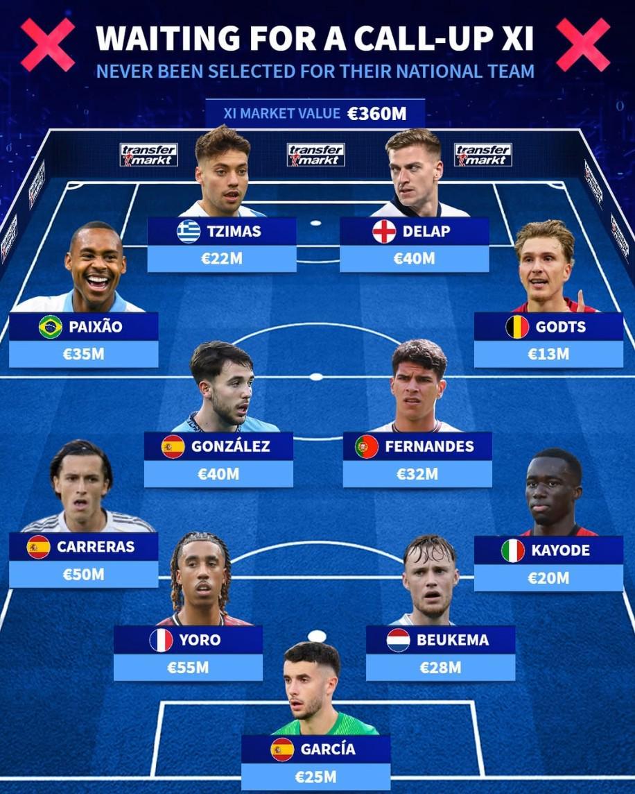 北京時(shí)間11月16日,德轉(zhuǎn)列出了從未入選過國(guó)家隊(duì)的11人陣容,其中包括了切爾西的德拉普、曼城的尼科-岡薩雷斯、皇家馬德里的阿爾瓦羅-卡雷拉斯、曼聯(lián)的約羅以及巴塞羅那的霍安-加西亞。