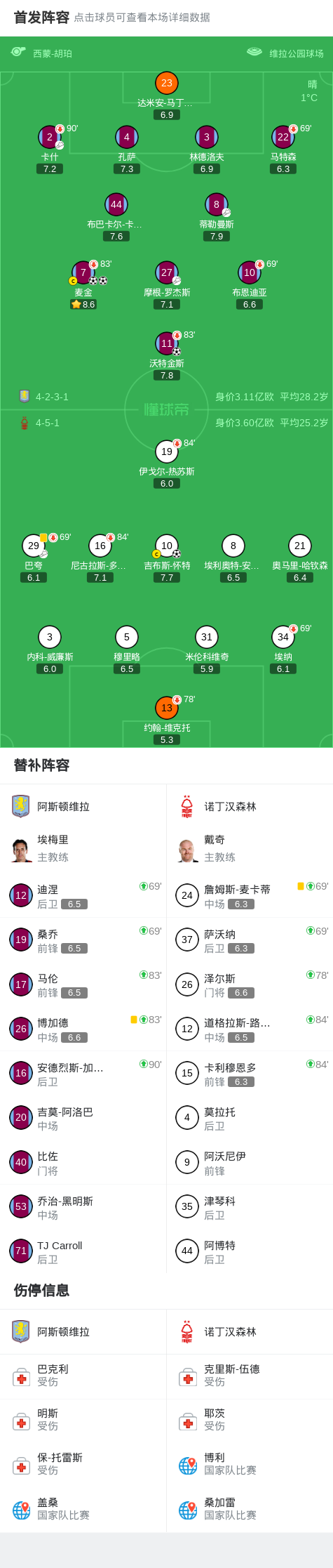 維拉3-1森林,麥金雙響,沃特金斯世界波,維克托送禮后傷退
