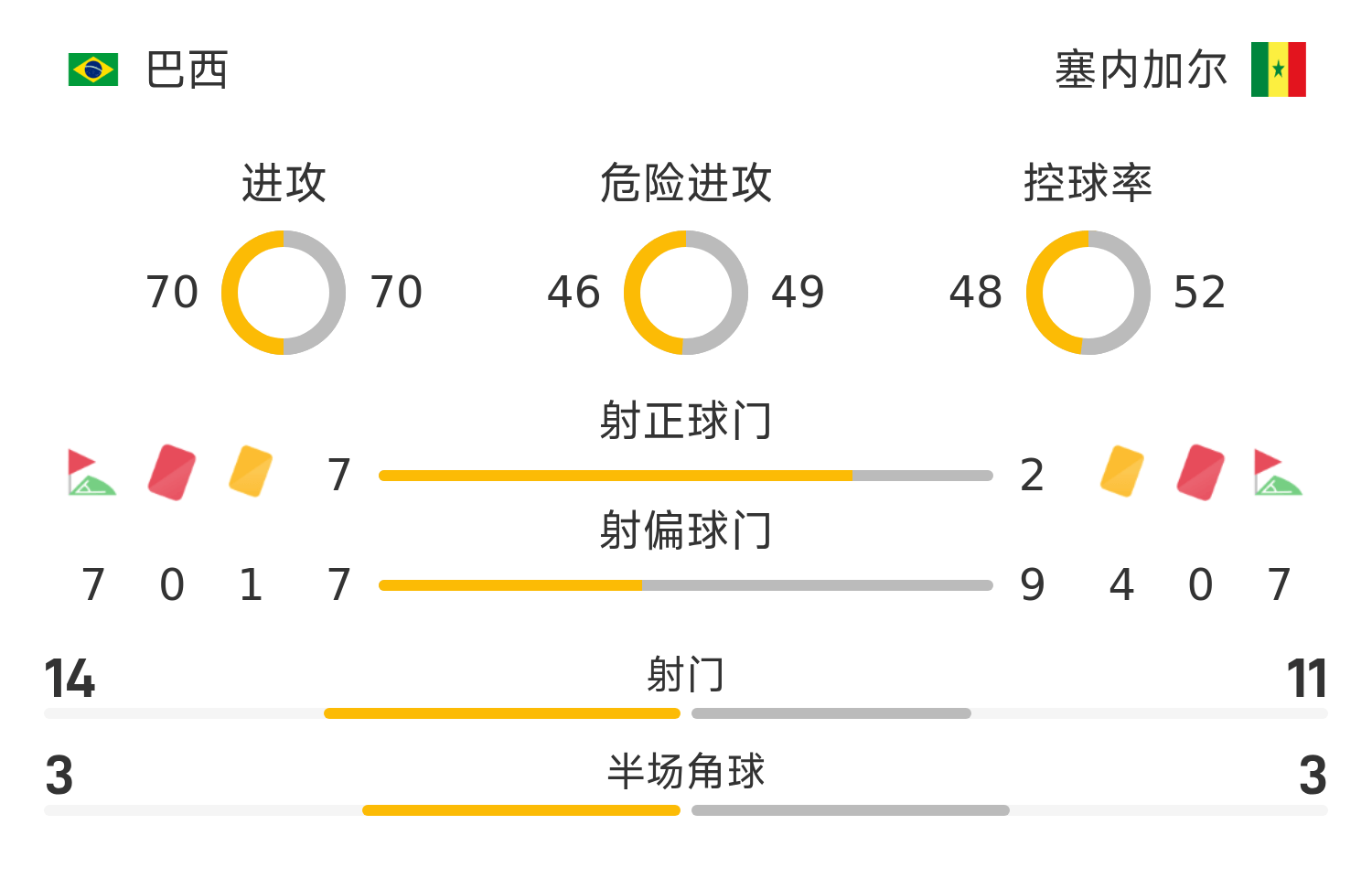 巴西首發(fā)陣容:23-埃德森、6-桑德羅(90’15-布魯諾)、4-馬爾基尼奧斯、2-米利唐、3-加布里埃爾(64’14-韋斯利)、5-卡塞米羅、8-吉馬良斯、7-維尼修斯(90’16-恩里克)、21-庫(kù)尼亞(65’22-佩德羅)、10-羅德里戈(83’11-帕奎塔)、20-埃斯特旺(83’19-恩里克)