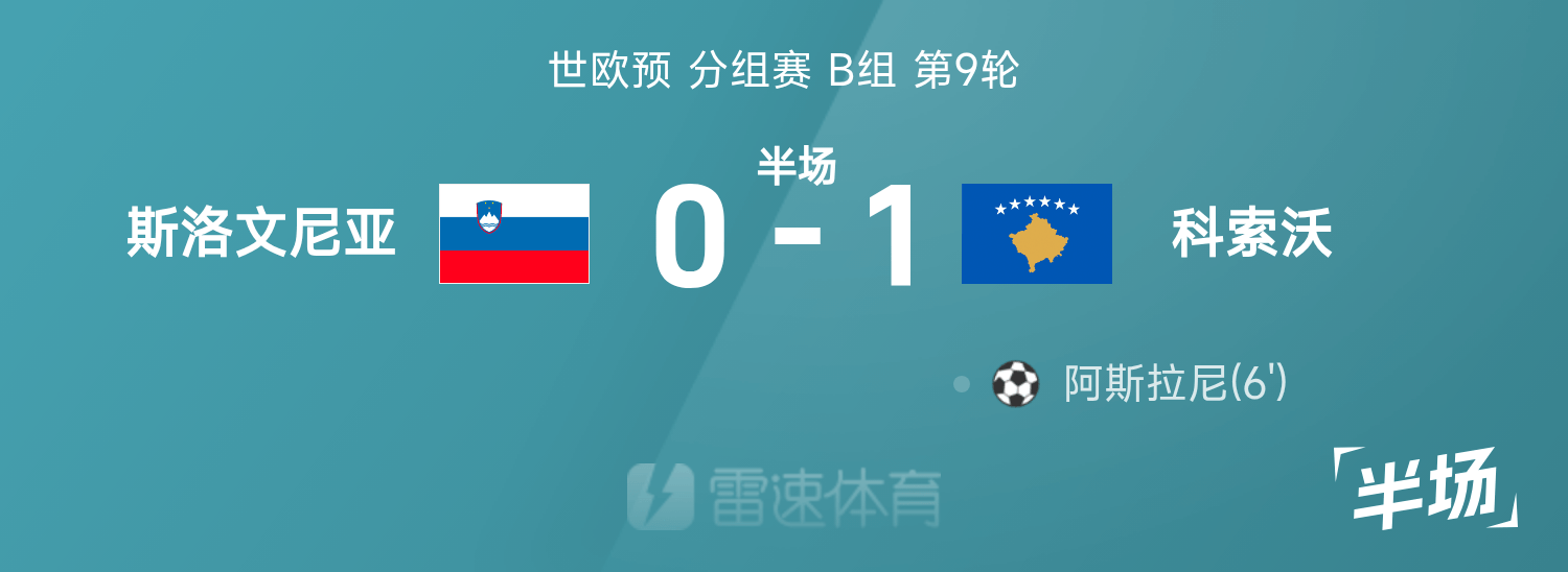 雷速體育11月16日訊 26賽季世歐預(yù)分組賽B組第9輪,斯洛文尼亞迎戰(zhàn)科索沃。半場(chǎng)戰(zhàn)罷,雙方比分暫為斯洛文尼亞0-1科索沃,阿斯拉尼破門建功。