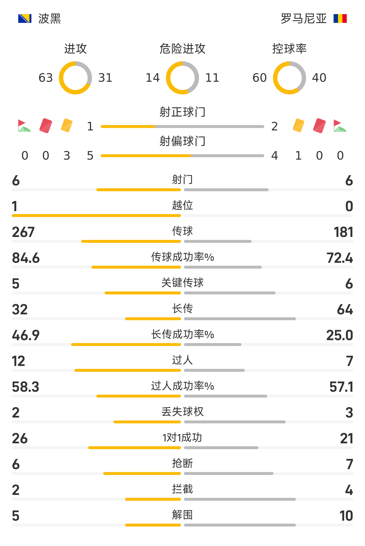 雷速體育11月16日訊 26賽季世歐預(yù)分組賽H組第9輪,波黑迎戰(zhàn)羅馬尼亞。半場戰(zhàn)罷,雙方比分暫為波黑0-1羅馬尼亞,比利吉亞破門建功。