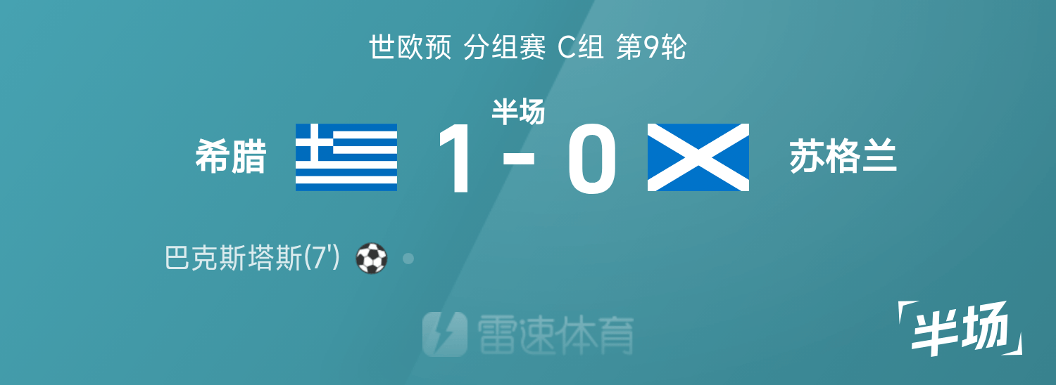 雷速體育11月16日訊 26賽季世歐預分組賽C組第9輪,希臘迎戰(zhàn)蘇格蘭。半場戰(zhàn)罷,雙方比分暫為希臘1-0蘇格蘭,巴克斯塔斯破門建功。