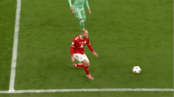 丹麥?zhǔn)装l(fā)陣容:1-舒梅切爾、3-韋斯特高、6-克里斯滕森、13-克里斯滕森、17-多爾古、10-埃里克森、15-諾爾高、23-霍伊別爾、14-達(dá)姆斯高、8-伊薩克森、19-溫德