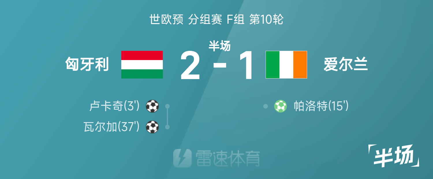 雷速體育11月16日訊 26賽季世歐預(yù)分組賽F組第10輪,匈牙利迎戰(zhàn)愛爾蘭。半場戰(zhàn)罷,雙方比分暫為匈牙利2-1愛爾蘭,帕洛特、瓦爾加、盧卡奇破門建功。
