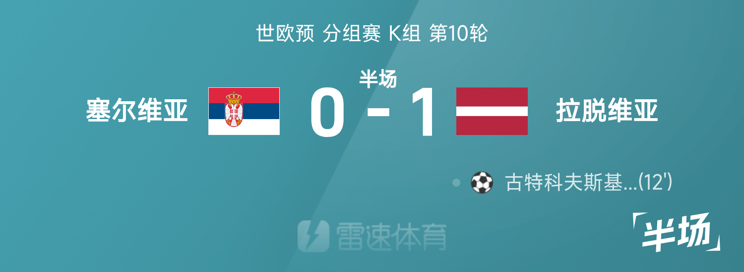 雷速體育11月17日訊 26賽季世歐預(yù)分組賽K組第10輪,塞爾維亞迎戰(zhàn)拉脫維亞。半場(chǎng)戰(zhàn)罷,雙方比分暫為塞爾維亞0-1拉脫維亞,古特科夫斯基斯破門(mén)建功。